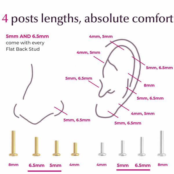 All our studs come wit the most commonly used lengths -- 5mm and 6.5mm. Some piercings need a bit longer or a bit shorter. We've got your back.