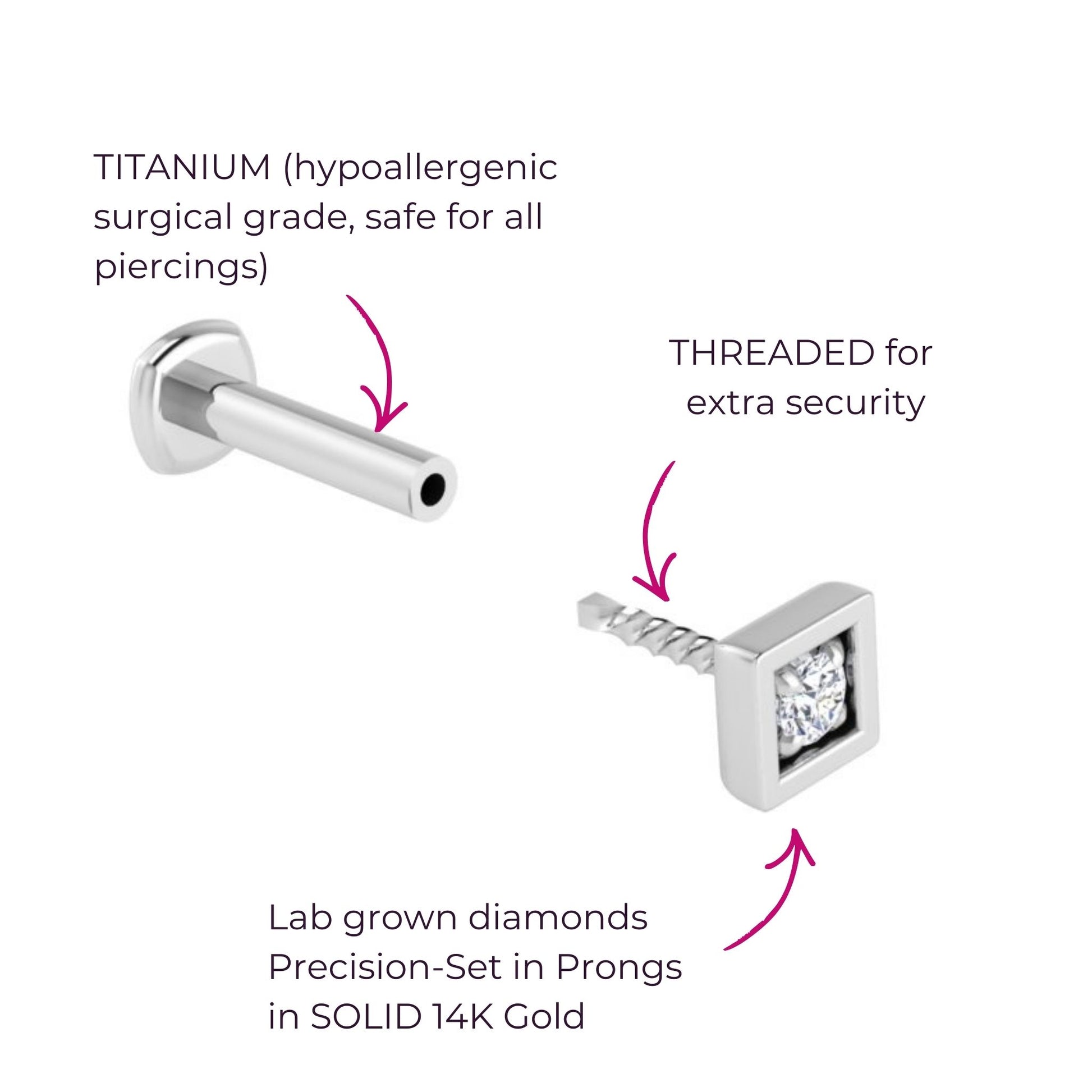The Edgy Stud brings structure and shine together in one effortless piece. A bold square softened by a rounded back rests with natural ease, while its prong-set ethical diamond catches light from every angle. Threaded to stay secure, it feels like a design that was always meant for you: steady, radiant, and ready for every moment.