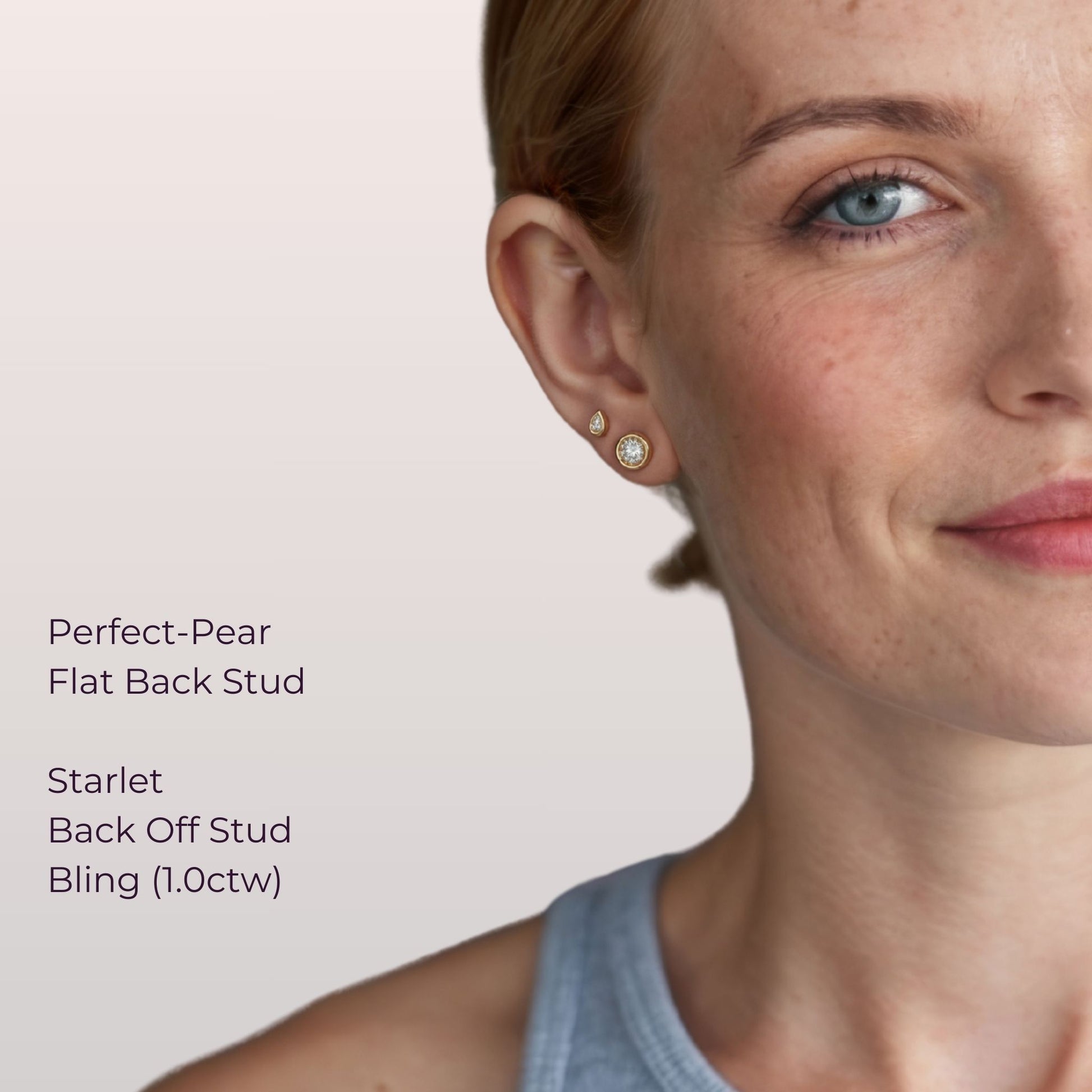 Flat back studs are inserted from the BACK, then the front stone inserts into the opening and screws in place. They are a great option for those piercings that you do not change often and want to leave in all the time. The flat back means: