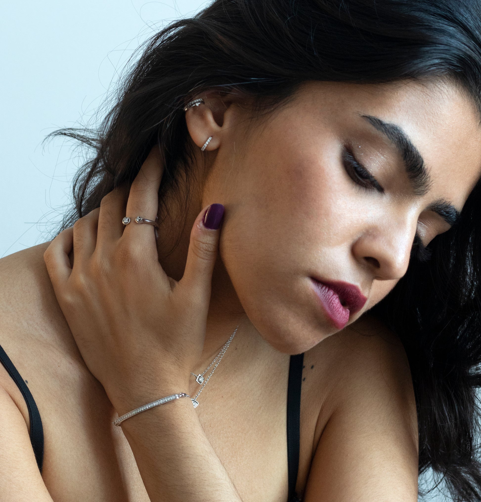 Gentle on skin and always nickel-free. We use recycled sterling silver and solid 14K gold. Both sterling silver and 14K white gold are rhodium-plated for a bright, lasting finish. Safe for sensitive wearers and lovers of fine materials.