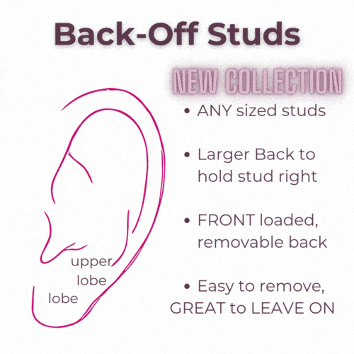 Back-OffStuds are inserted from the front,just like a traditional stud. However, ours have a short post with TWO adjustable options to get you the perfect, snug fit. These are easy to remove AND perfectly safe and comfortable to leave in 24/7. With these studs: