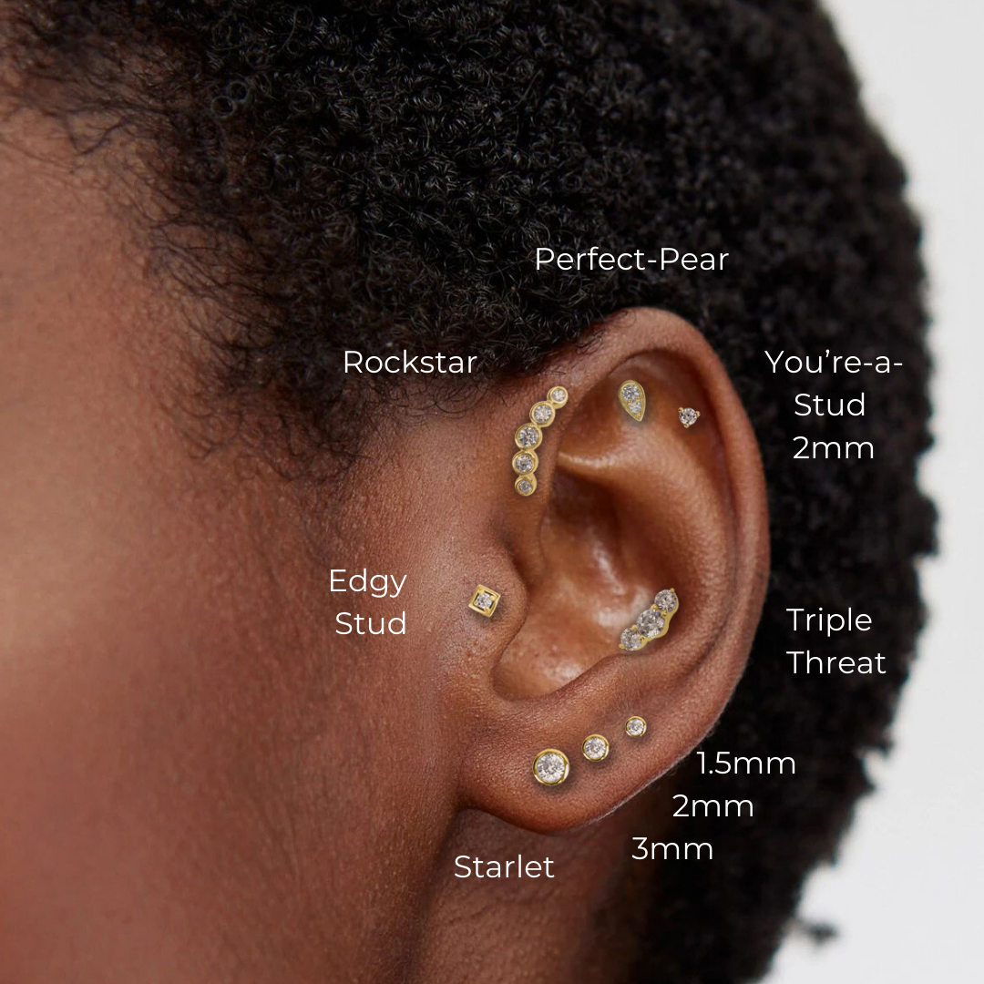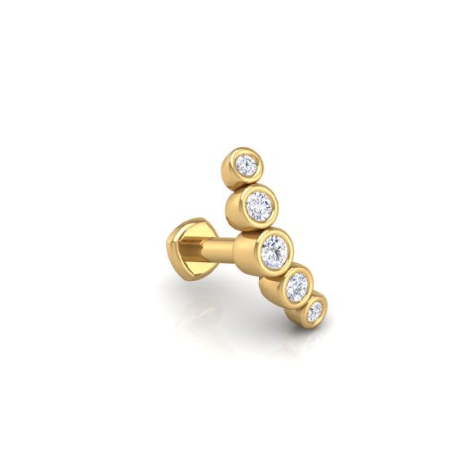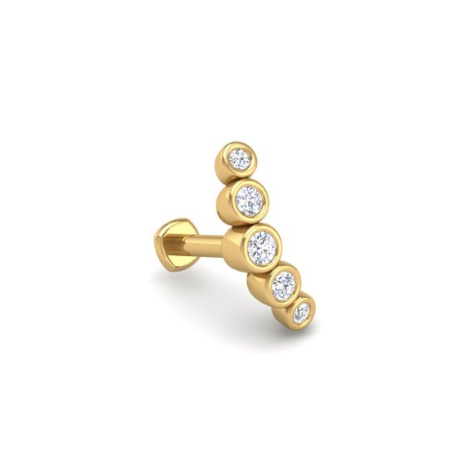 Five ethical diamonds form a gentle curve, tapering in size as they catch the light. Set in a bezel that rests close, they trace a line of brilliance along the skin. The threaded post holds steady with ease, letting the Rockstar stay in place so its glow moves naturally with you.