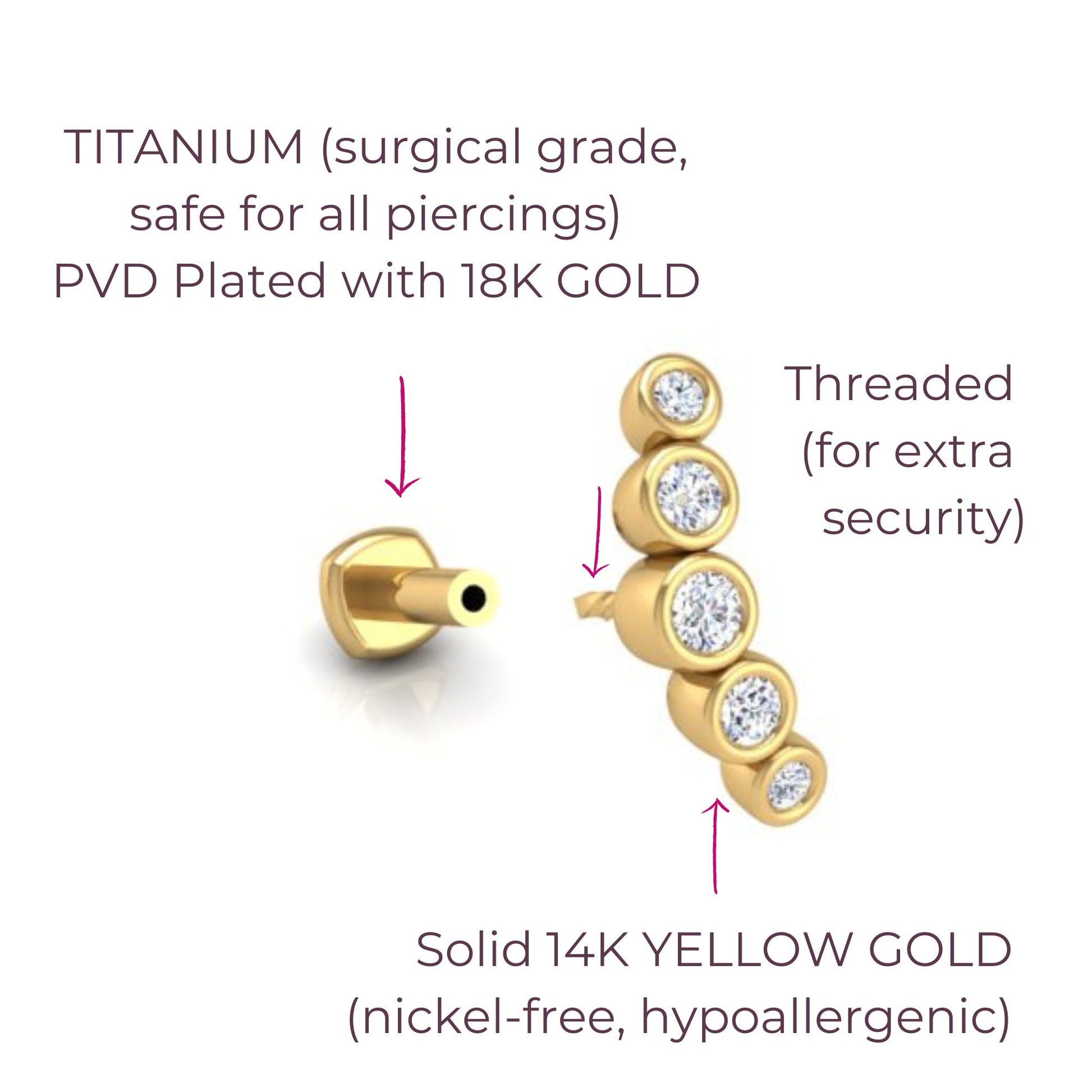 ✦ Recycled solid 14K yellow gold top with 18-gauge surgical-grade titanium threaded post.