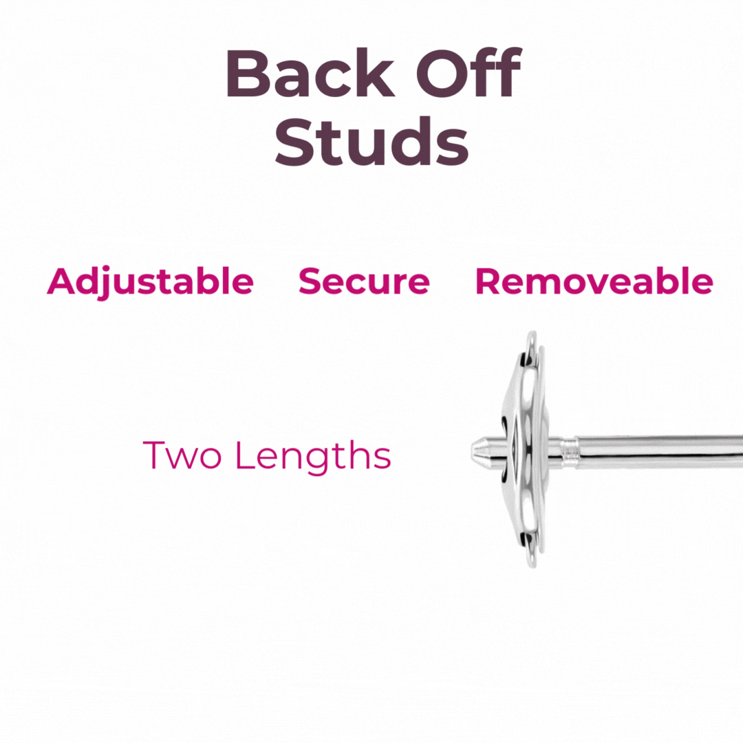 Back-OffStuds are inserted from the front,just like a traditional stud. However, ours have a short post with TWO adjustable options to get you the perfect, snug fit. These are easy to remove AND perfectly safe and comfortable to leave in 24/7. With these studs: